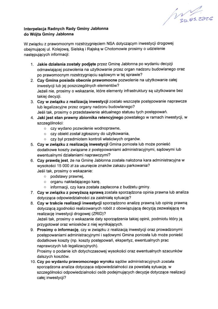 Radni chcą ustalić, czy gmina poniosła lub może ponieść dodatkowe koszty związane z inwestycją. Pytają też o karę administracyjną w wysokości 15 tys. zł za usunięcie znaków zakazu parkowania – w tym o podstawę prawną, organ nakładający i czy kara została opłacona z budżetu gm. Jabłonna.
